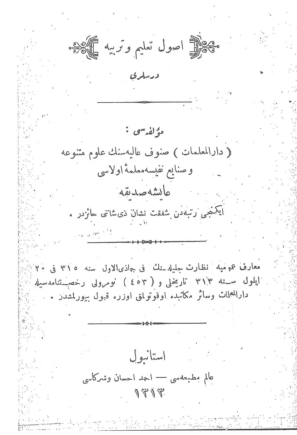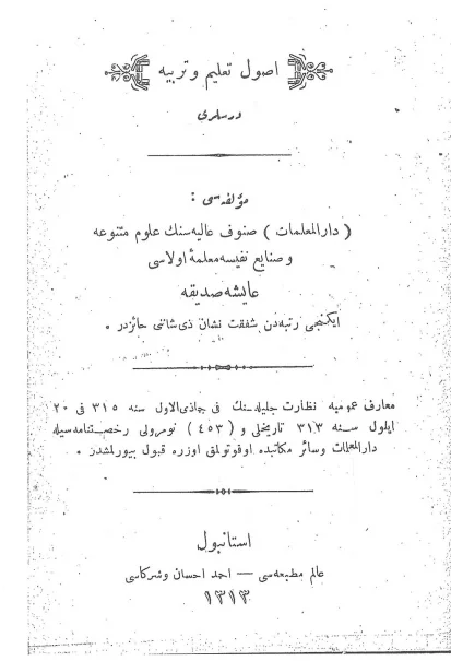 Ayşe Sıdıka. Usûl-i Talim ve Terbiye Dersleri. İstanbul: Âlem Matbaası, Ahmet İhsan ve Şürekâsı, 1313/1897.